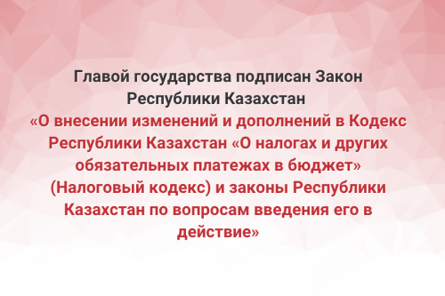 Главой государства подписан Закон Республики Казахстан «О внесении изменений и дополнений в Кодекс Республики Казахстан «О налогах и других обязательных платежах в бюджет» (Налоговый кодекс) и законы Республики Казахстан по вопросам введения его в действие»